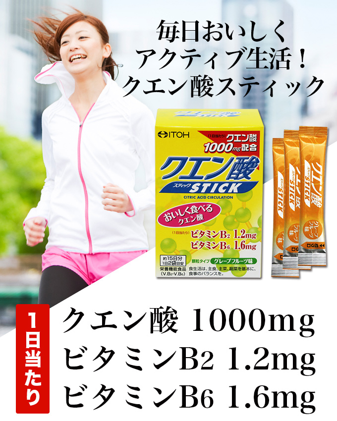 【クエン酸スティック】はクエン酸に、ビタミンB2、ビタミンB6を配合し、水なしで食べられる顆粒スティックタイプです。スッキリとした酸味とフルーティーな甘さのグレープフルーツ味で、毎日おいしく続けられます。【クエン酸スティック】でアクティブな毎日をしっかりサポート!