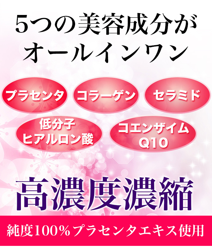 プラセンタ、コラーゲン、低分子ヒアルロン酸、セラミド、コエンザイムQ10の5つの美容成分がオールインワン!