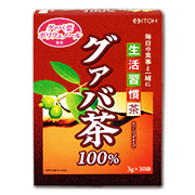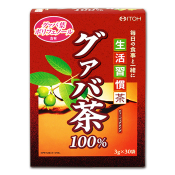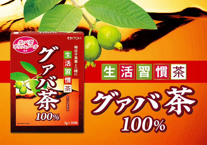 グァバは、熱帯アメリカ原産の常緑低木で白い花を咲かせます。果実はジュースやジャムなどに、葉は健康茶として幅広く利用されています。また、葉にはグァバ葉ポリフェノールが含まれています。本品は、グァバの葉を100%使用した生活習慣茶です。毎日の食事と一緒にお飲みください。