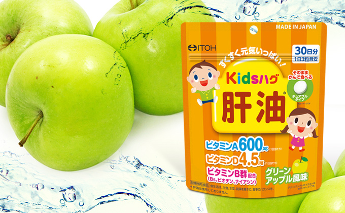 「肝油」の主成分であるビタミンAとビタミンDに加え、成長期に必要なビタミンB群を3種類配合し、お菓子感覚で食べられる、子供向けサプリメント。グリーンアップル風味のチュアブルタイプでそのまま食べられます♪
