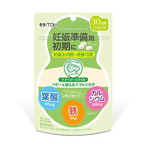 【ママベビースマイル ベビーを迎えるママのミカタ 準備期・初期】は妊娠準備期から妊娠初期(妊娠3ヶ月前~妊娠13週まで)に不足しがちな栄養素である葉酸・鉄・カルシウムにビタミン7種類をプラスした、ベビーを迎えるママをサポートしてくれるサプリメントです。