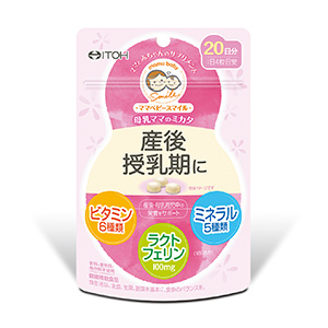 【ママベビースマイル 母乳ママのミカタ 産後・授乳期】はビタミン6種類、ミネラル5種類にラクトフェリンを配合。産後・授乳期の赤ちゃんを育てる母乳ママに必要な成分をサポートし、忙しい産後ママの毎日を応援するサプリメントです。