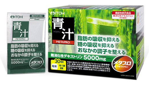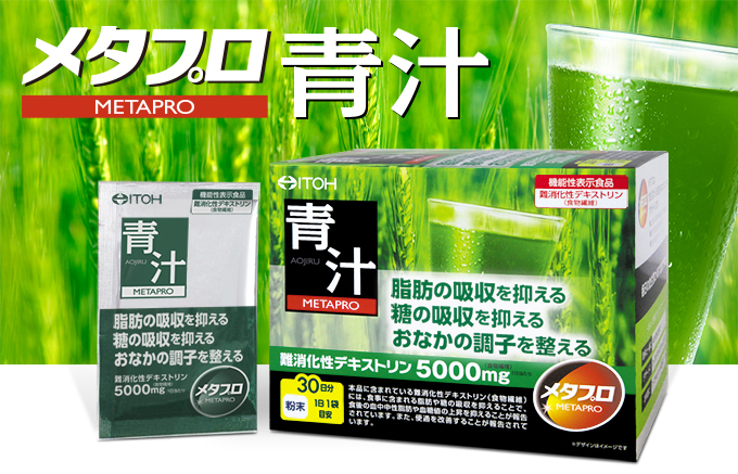 機能性関与成分「難消化性デキストリン(食物繊維)」には食事に含まれる脂肪の吸収を抑えて排出を増加させ、また糖の吸収を抑えることで食後の血中中性脂肪や血糖値の上昇を抑えること、便通を改善することが報告されており(参考資料㈰参照)、食後の血糖値や脂肪が気になる方、おなかの調子を整えたい方におすすめの機能性表示食品【メタプロ青汁】です。