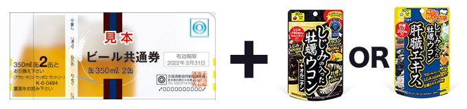 *モニター商品としてお届けするのは、応募時アンケートで回答された【しじみの入った牡蠣ウコン+オルニチン】か【しじみの入った牡蠣ウコン肝臓エキス】のどちらか欲しい商品の1商品とビール券(缶350ml 2缶)1枚のセットになります。