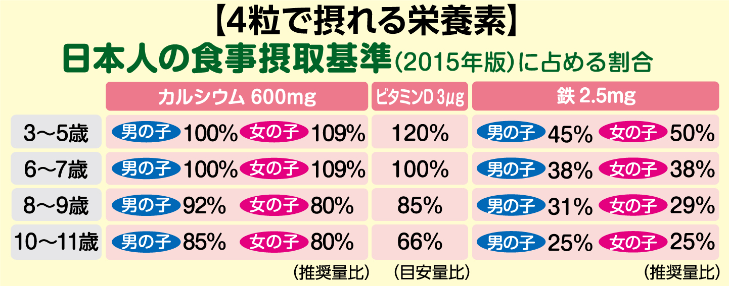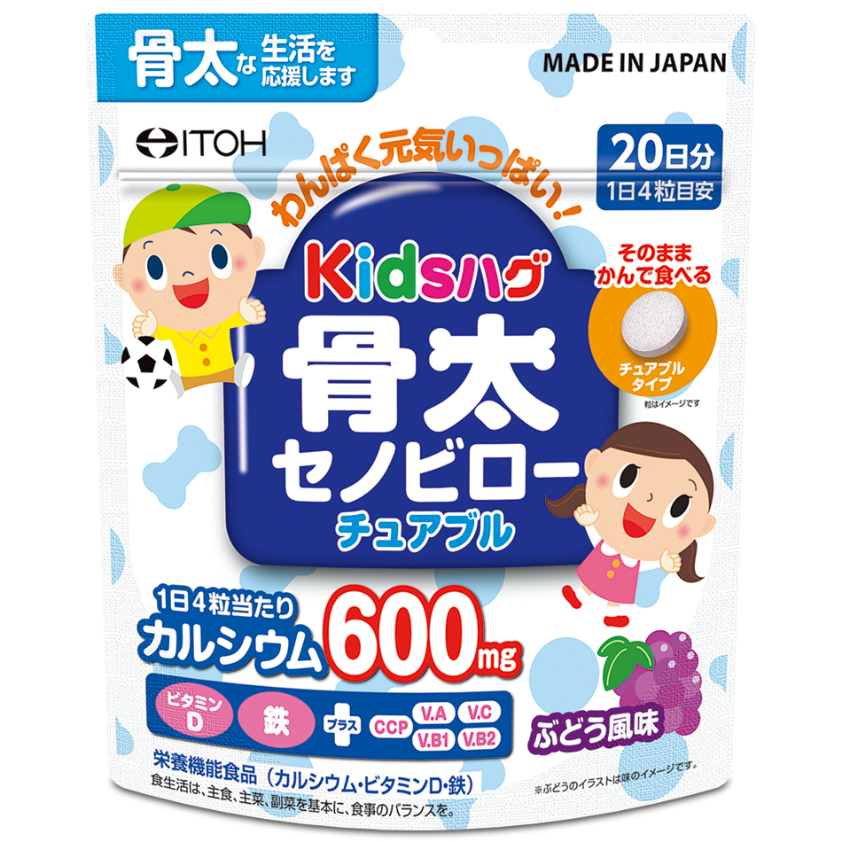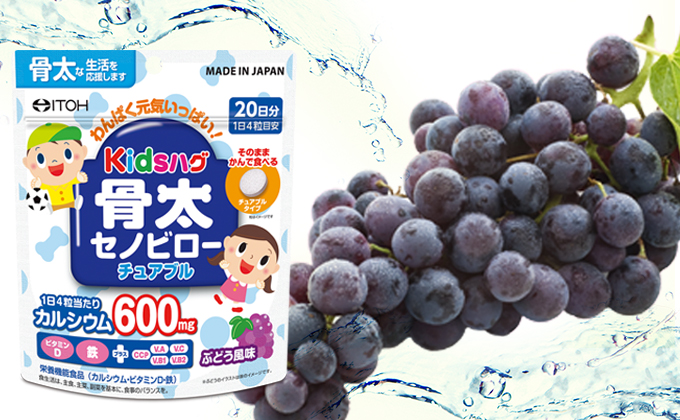お子さまの成長に必要な成分が入った、お菓子感覚で食べることができるチュアブルタイプの栄養機能食品のです。1日4粒でカルシウム600mg、更にビタミンD、鉄などのビタミンとミネラルを配合し、お子さまの健やかな成長をサポートします。甘くて爽やかなぶどう風味に仕上げました。