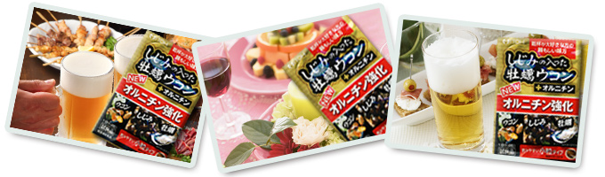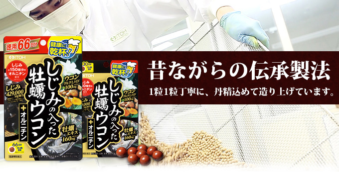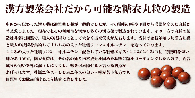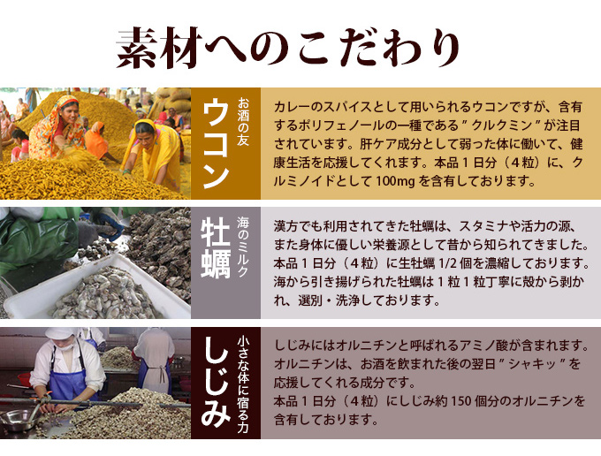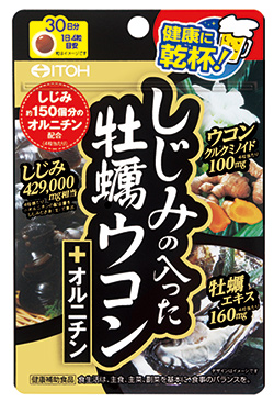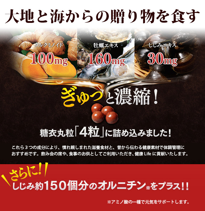 大地の恵みを含んだ「ウコン」と大海の恵みを含んだ「牡蠣」「しじみ」。3種のいたわり成分に加え、1日当たりしじみ約150個分のオルニチンを配合した、楽しい大人の時間と健やかな日々を応援するサプリメント。飲みやすい小粒(糖衣)タイプです。
