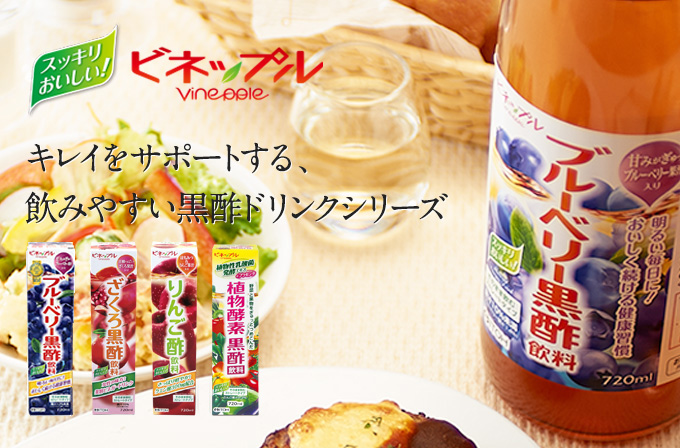 ビネップル 植物酵素黒酢飲料 17種類の素材を使用した植物発酵エキスにプラセンタをプラス。 国産にこだわった17種類の野菜と果物を使用した植物性乳酸菌発酵エキスとキレイサポート成分プラセンタを配合。そのまま飲んでも、お湯や水で割ってもOK! パッケージに記載されているオリジナルレシピで、さらにおいしく。 商品の詳細はこちら |