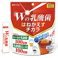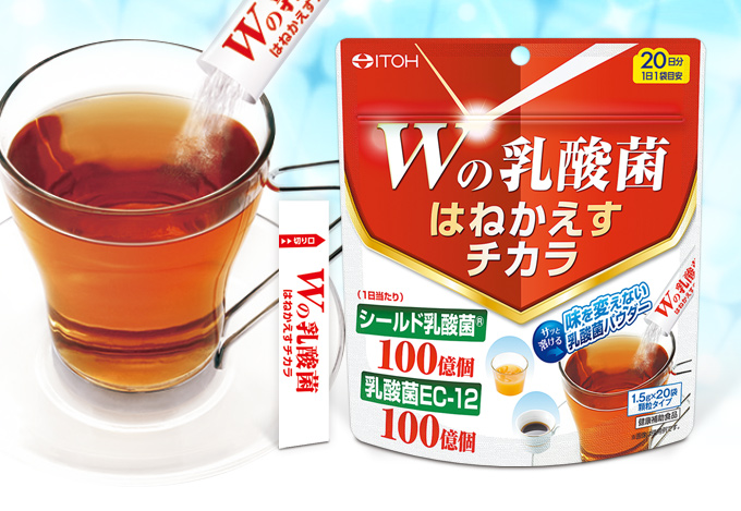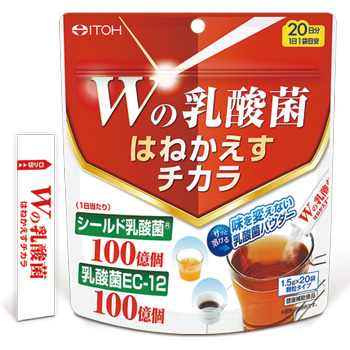 【Wの乳酸菌 はねかえすチカラ】は「シールド乳酸菌®」100億個と「乳酸菌EC-12」100億個を配合(1日当たり)。数多くの種類がある乳酸菌の中から、「はねかえす力」に着目し選んだ2種類の乳酸菌「シールド乳酸菌®」と「乳酸菌EC-12」。“はねかえす力”、“健やかさ”、“すっきり”といった、毎日の健康サポート乳酸菌パウダー商品です。