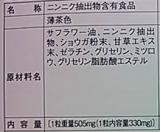 サフラワー油、ニンニク抽出物、ショウガ粉末、甘草エキス末、ゼラチン、グリセリン、ミツロウ、グリセリン脂肪酸エステル