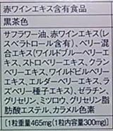 サフラワー油、赤ワインエキス(レスベラトロール含有)、ベリー混合エキス(ワイルドブルーベリーエキス、ストロベリーエキス、クランベリーエキス、ワイルドビルベリーエキス、エルダーベリーエキス、ラズベリー種子エキス)、ゼラチン、グリセリン、ミツロウ、グリセリン脂肪酸エステル、カラメル色素