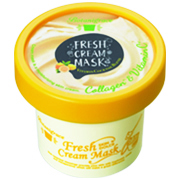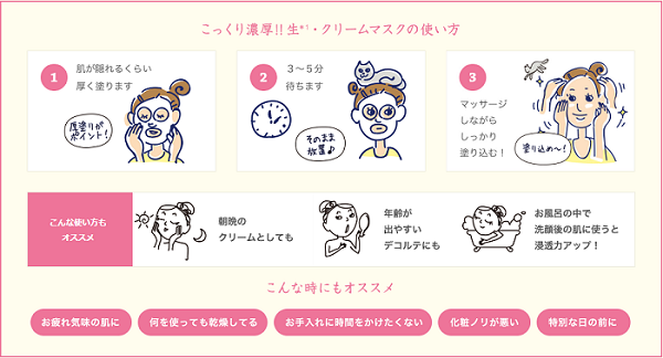 濃厚ふわトロ生クリームマスクが吸い付くように肌に密着。生コラーゲン、シアバター、リピジュア(R)、セラキュート(R)などの美容成分をリッチに配合し、生クリームのようなふんわりとろりとしたテクスチャーで肌に吸い付くように密着。ラッピング効果でふっくらやわらか肌に導く新感覚のスペシャルケアアイテム。