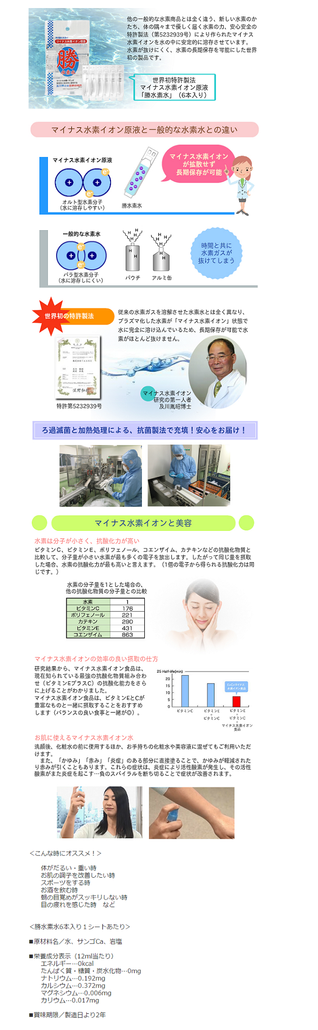 【勝水素水】は、他の一般的な水素商品とは全く違う、新しい水素のかたち、体の隅々まで優しく届く水素の力、安心安全の特許製法(第5232939号)により、マイナス水素イオンを水の中に安定的に溶存させています。水素が抜けにくく、水素水の長期保存を可能にした世界初の製品です。