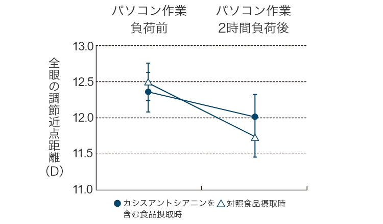 カシスアントシアニン50mgを含む食品または対照食品を摂取して2時間後から、パソコン作業負荷を2時間行い、