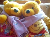 「株式会社ジェーピーツーワンさんからマフラーが届いたよおやっ500円のクーポン券もついてるよ」「キレイな色だね」「ラベンダーのような色だね」「あたたかい」「いいなぁ」「ヴィヴィアンウエストウッドのロングマフラーは、長いから2人でまけるね」 2010/01/06