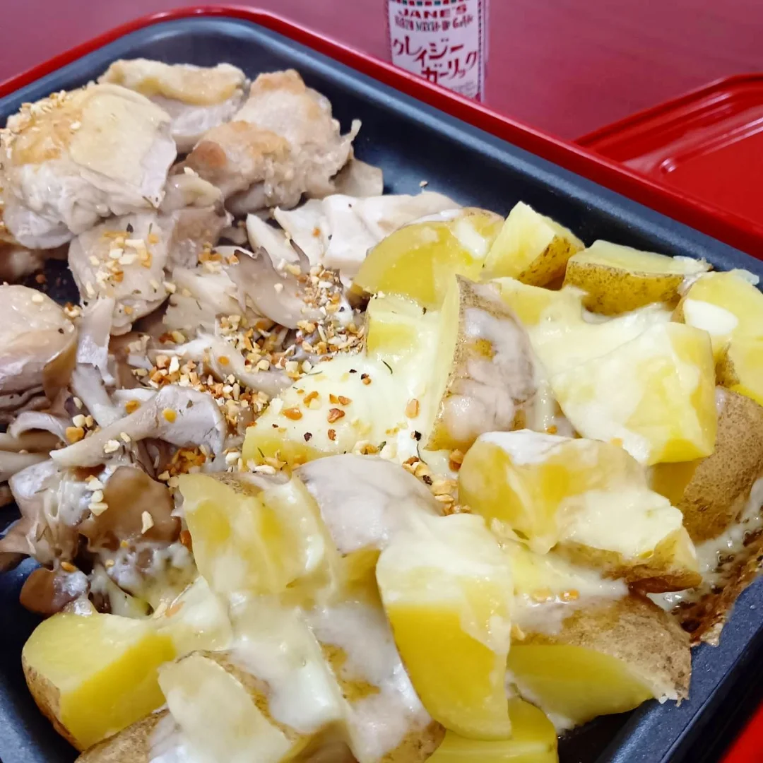 ホットプレートで鶏モモ肉/チーズじゃが/ 舞茸/エリンギをバターでこんがり焼いて、仕上げにクレイジーガーリックをサッとひと振り…