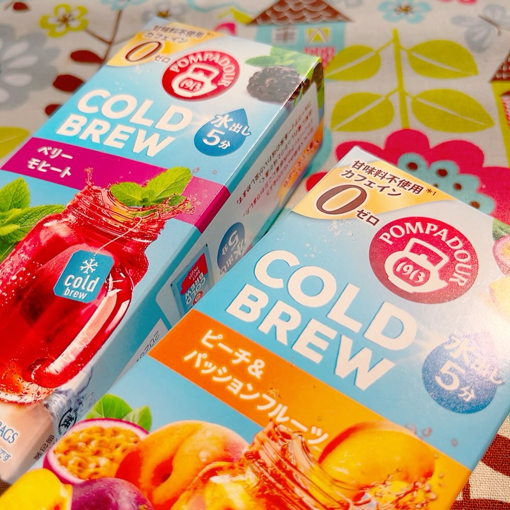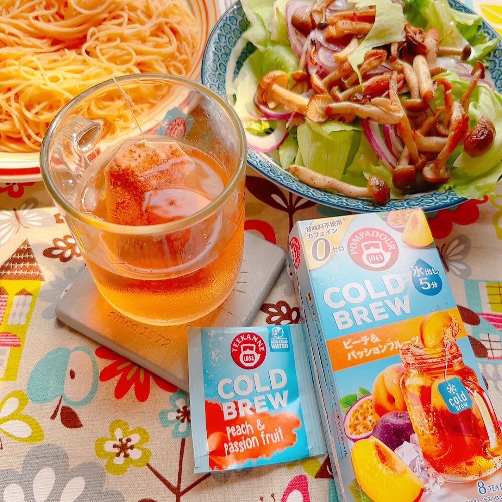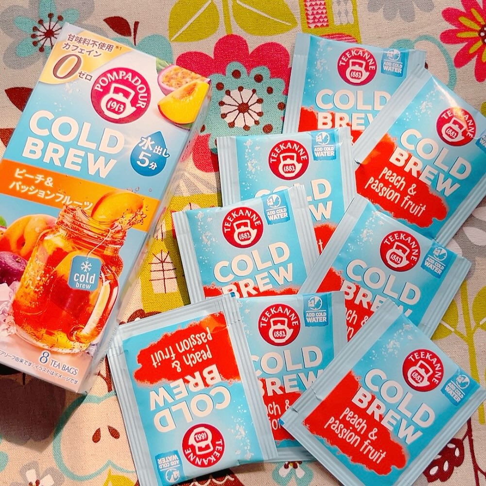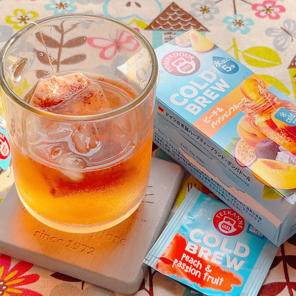 ■ほんのり甘いピーチの香りとパッションフルーツの爽やかな酸味。 ■ポンパドール「コールドブリュー」は、ポンパドールの水出しハーブティーシリーズ。1ティーバッグを250mlの水に入れて、常温5分でお召し上がりいただけます。カフェインゼロでフルーティーな味わいのため、お子さまとも一緒に楽しめます。