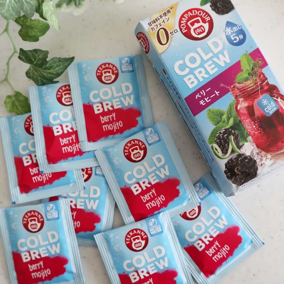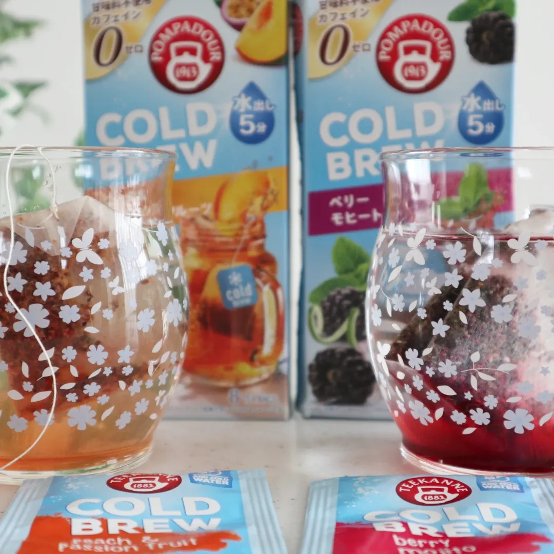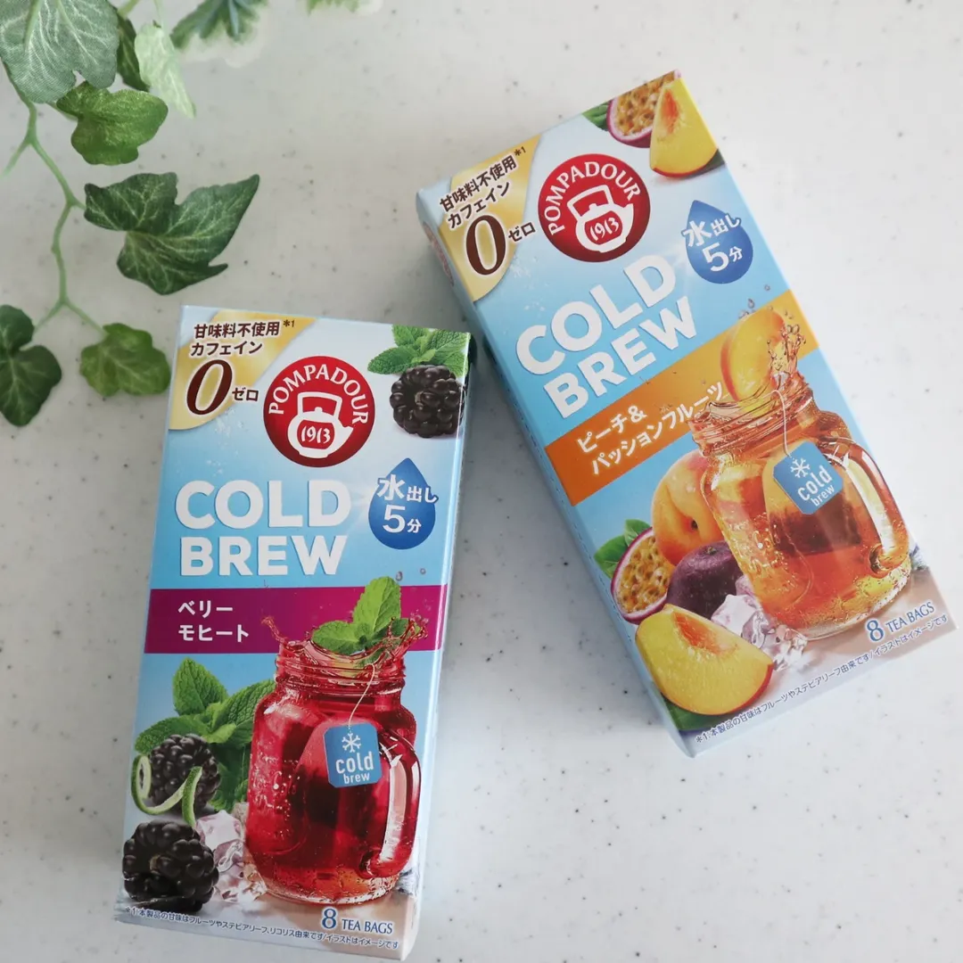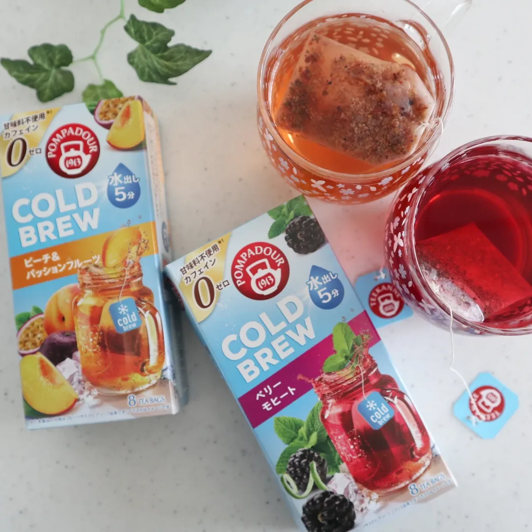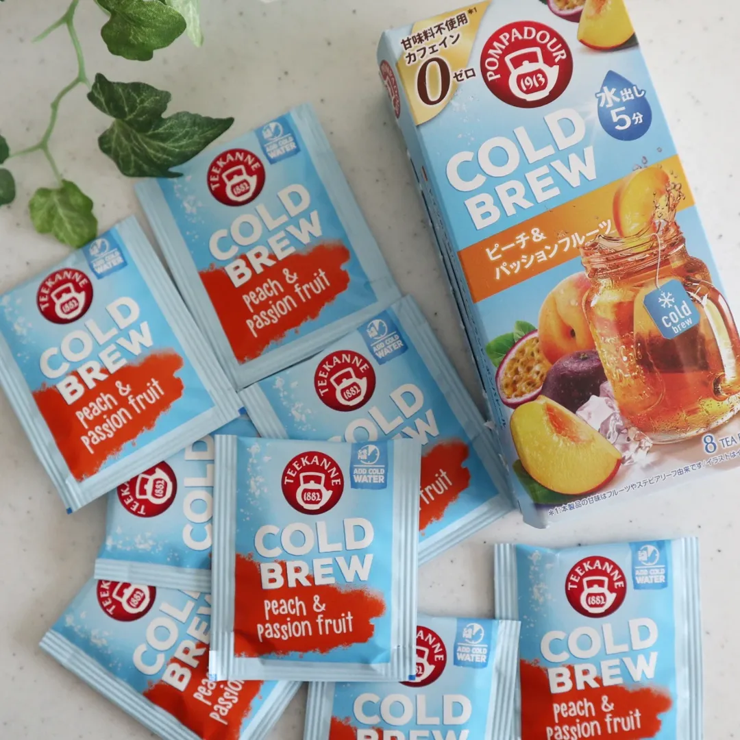 ■ほんのり甘いピーチの香りとパッションフルーツの爽やかな酸味。 ■ポンパドール「コールドブリュー」は、ポンパドールの水出しハーブティーシリーズ。1ティーバッグを250mlの水に入れて、常温5分でお召し上がりいただけます。カフェインゼロでフルーティーな味わいのため、お子さまとも一緒に楽しめます。