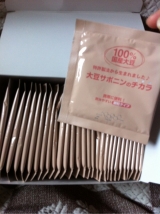 【大豆サポニンのチカラ】です 中身は、飲みやすいように、一回分ずつ個包装になっています 「便通にウルトラお困りの方へ!」と書いてあったので、これは試してみなきゃ! って思ってしまいました ぴわびは、20年来の便秘症なんです 2013/01/11