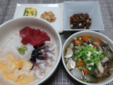 夜は青森産の鮃とエンガワと塩釜産鉢鮪の赤身と愛知産青柳ととり貝で海鮮丼に 付け合わせは韮入り自家製玉子焼に菊屋中村さんのたけのこゆばと五目ひじき煮に どんこと舞茸とぶなしめじとエリンギと人参と玉葱ともやしと牛蒡のけんちん汁 2019/03/12