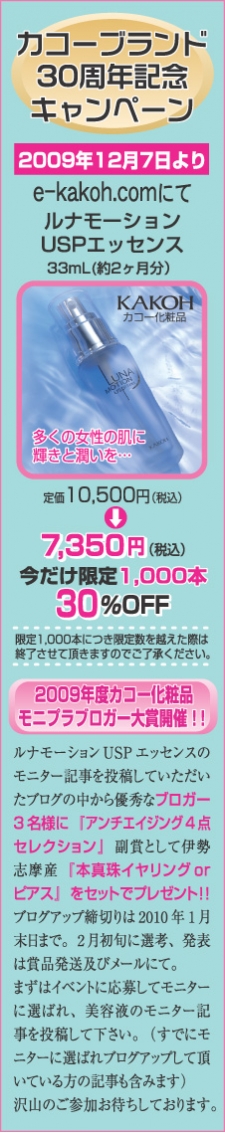 カコー ルナ モーション USP エッセンスはナノテクノロジーの最先端技術を取り入れた高機能スキンケア美容液として誕生しました。加齢による肌の悩み(乾燥・小じわ・たるみ・シミ・くすみ・肌荒れなど)を改善へと向かわせる高機能化粧品の使用効果が、最高レベルで実感できます。