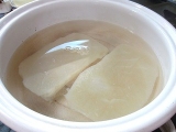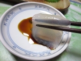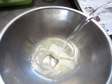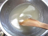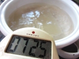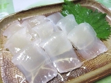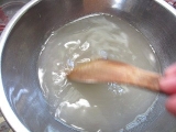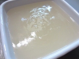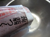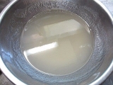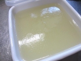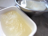| ●まず、水500ccと蒟蒻粉1袋をボールに入れます。 水を多くすると柔らかい蒟蒻、少なくすると固い蒟蒻になります。 (増減は1割程度) <ポイント>お湯は使わないでください。 ●あまり泡立てないよう、静かにまんべんなく混ぜます。 混ぜるうちに粘度が増し、半透明の糊状になります。 <ポイント>青のり・ゴマ・唐辛子・スパイス等を 入れるとお好みの蒟蒻が作れます。 ●このまま1時間放置します。 (長時間放置しないでください。12時間以内には「作り方5」へ進んでください。 ●成型します。 板蒟蒻にする場合は四角い容器に流し込みます。 量の目安としては、蒟蒻の厚さ2~3cmくらいまでにしてください。 ●鍋に1000ccのお湯を沸かします。 蒟蒻を板状に切るか水で濡らしたお椀ですくい、 玉状にしたものを鍋に入れます。 5分くらい茹でて、火を止め自然にさまします。 ●これでおいしい蒟蒻の出来上がり。 すぐ食べるなら水で冷やして刺身蒟蒻に。 そのままさました蒟蒻を取り出し ビニール袋や容器に入れ冷蔵庫で保存すれば 10日から2週間は持ちます。 <ポイント>水で冷やした蒟蒻は、そのままさました蒟蒻より 日持ちが悪くなりますのでご注意ください。 |