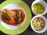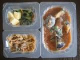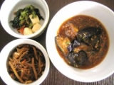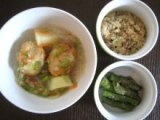 「とうふハンバーグ」、「鶏つくねの春雨スープ」、「麻婆茄子」の3点セット。