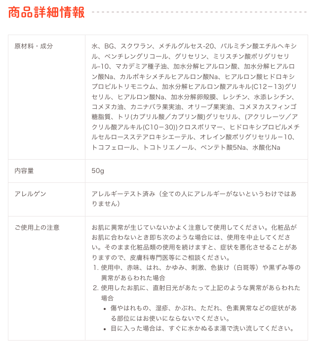 ヒアルロン酸研究約40年のキユーピー(株)が独自開発した、5種類の機能性ヒアルロン酸を配合。日本初※配合の「ハリ生成ヒアルロン酸」に加え、「保護ベールヒアルロン酸」、「整肌ヒアルロン酸」、「高浸透ヒアルロン酸」、「濃厚保湿ヒアルロン酸」を組み合わせました。また、卵から抽出した卵黄レシチンと卵殻膜も配合し、伸びが良くやわらかいテクスチャーを実現しました。