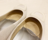 ハーフタイプで透明素材だから目立ちにくく、パンプスやサンダルなどにもオススメ。また、水洗いすると粘着力が戻るので、何度でも貼りなおすことができ、衛生的です。