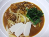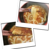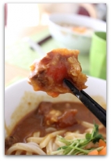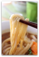 煮込んだ牛すじと従来の大生姜よりも保温効果があるといわれる黄金生姜のカレーうどんです。うどんは水分含有率4分の1の生めんに限りなく近いモチモチ、シコシコとした食感が特徴のエッジのたった半生讃岐うどん(太切麺)です。