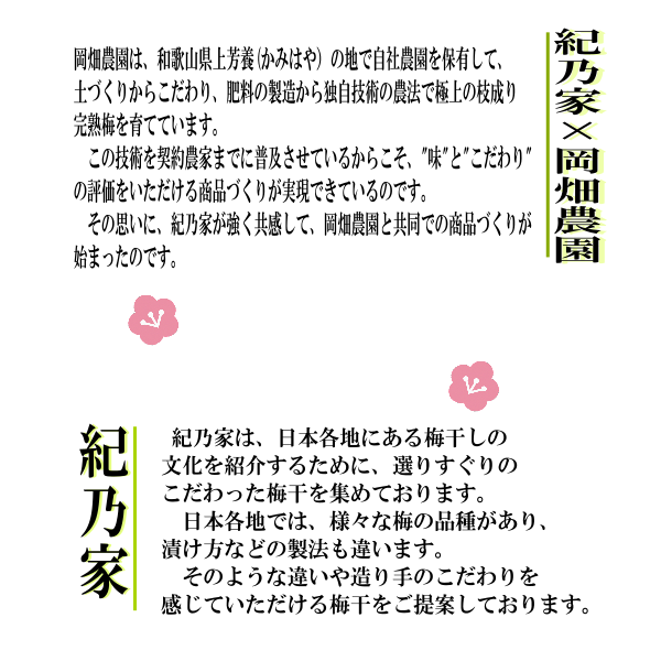 原料には岡畑農園で大切に育てた紀州産の枝成り完熟梅を使用しています。お口の中でとろける柔らかい果肉からはハチミツの甘味がたっぷり。5%にまで塩分を抑えているのに梅の旨味はしっかり。お茶請け・おやつとしても喜ばれています。