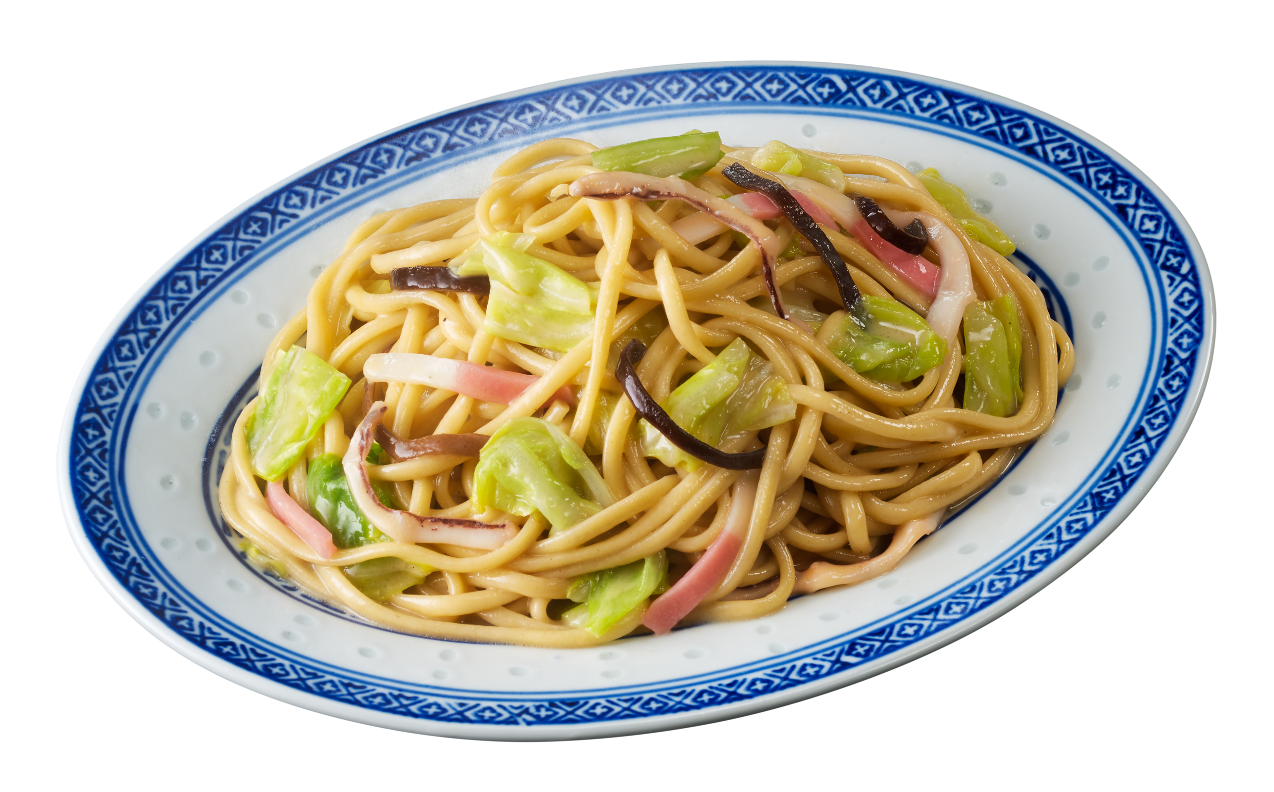 <具材>鉄鍋で炒めた香ばしい野菜やイカ、きくらげなど5種の具材を盛り付けました。細切りの紅白かまぼこが彩りを添えています。