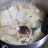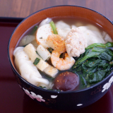 <具材>8種の具材入り/えび、つくね、椎茸、ほうれん草、白菜、きざみ揚げ、焼かまぼこ、麩