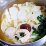 だし、具、麺が一つになったうどん。お鍋に入れて温めるだけでお召し上がりいただけます。