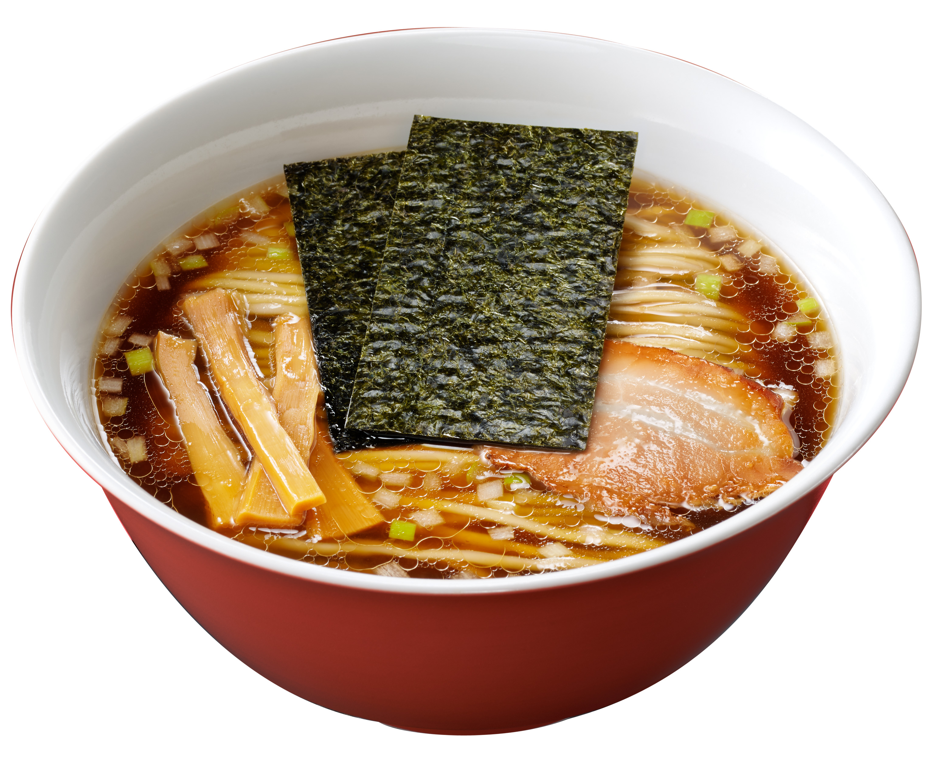 直火焼きチャーシュー、メンマ、白ネギに加え、後のせ可能な別添小袋入りの焼きのり付きです。
