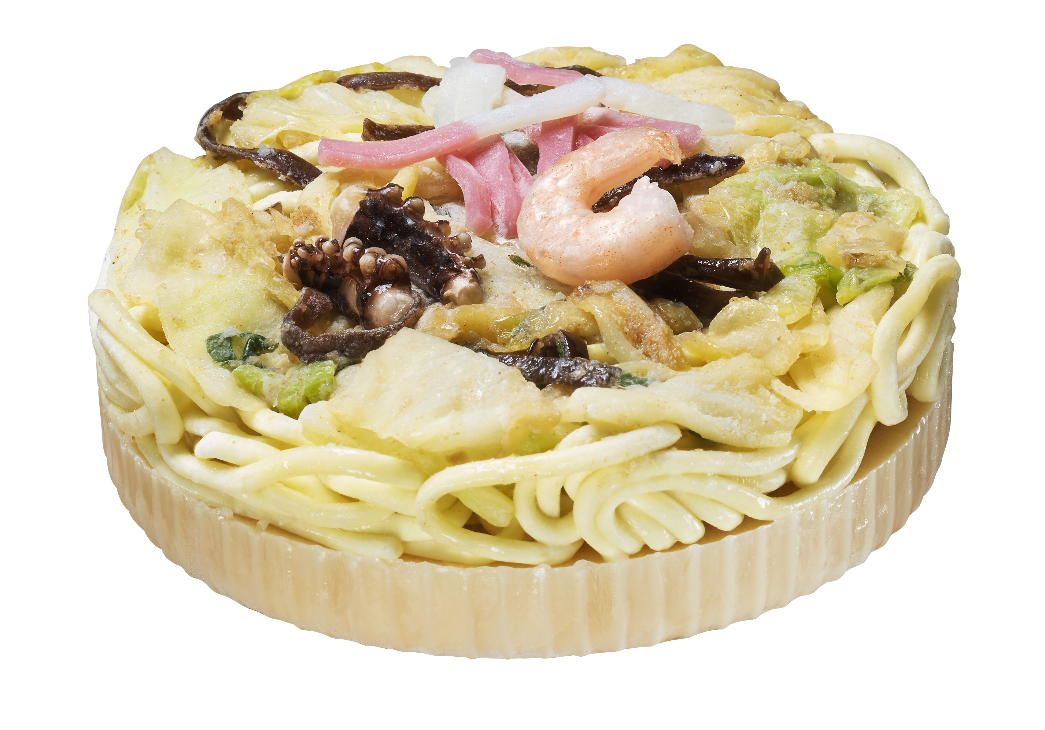 <具材>野菜を鉄鍋で炒めることで、食感を残して香ばしく仕上げました。キャベツ、九条ねぎ、きくらげ、えび、イカ、かまぼこを彩り豊かに盛り付けています。