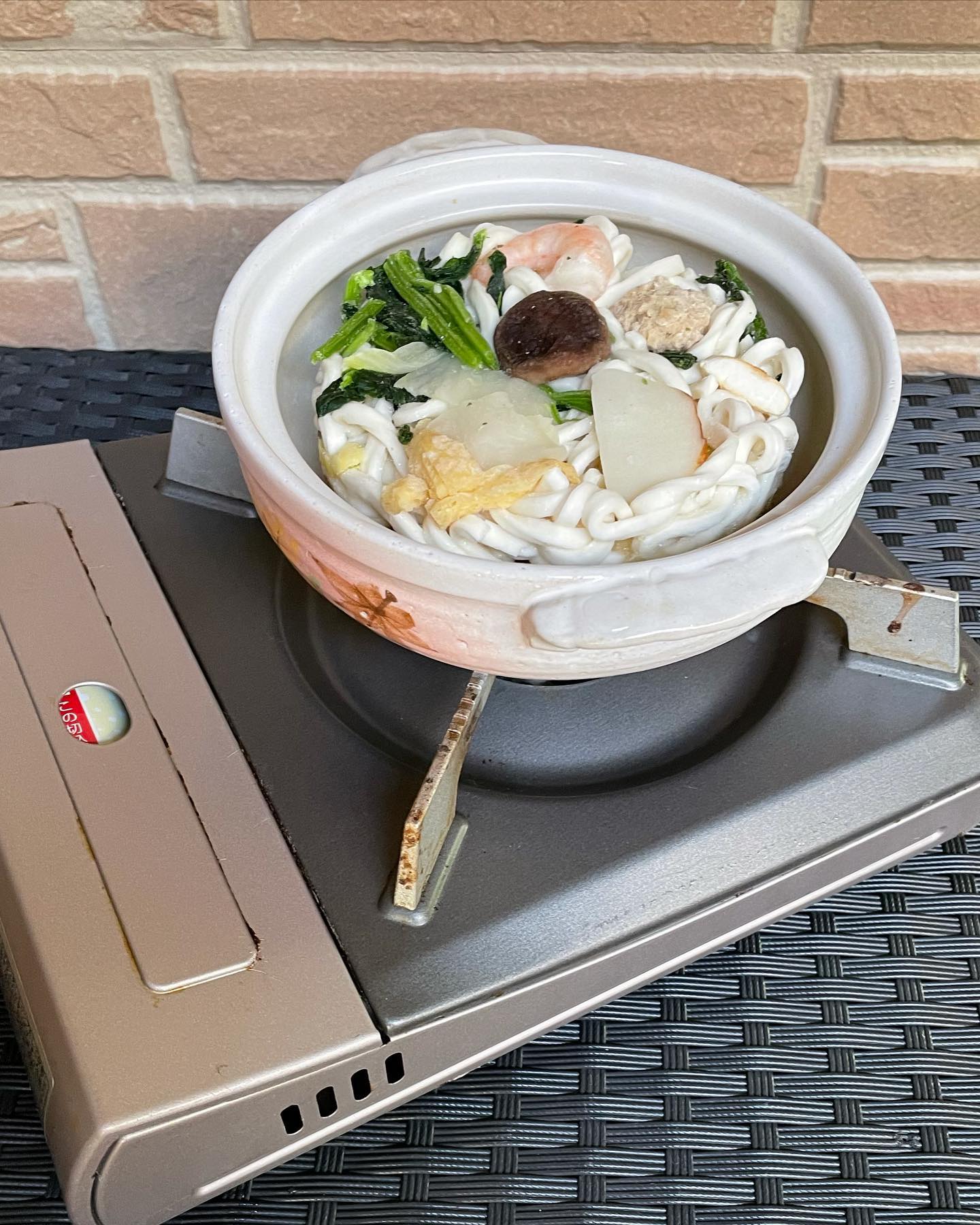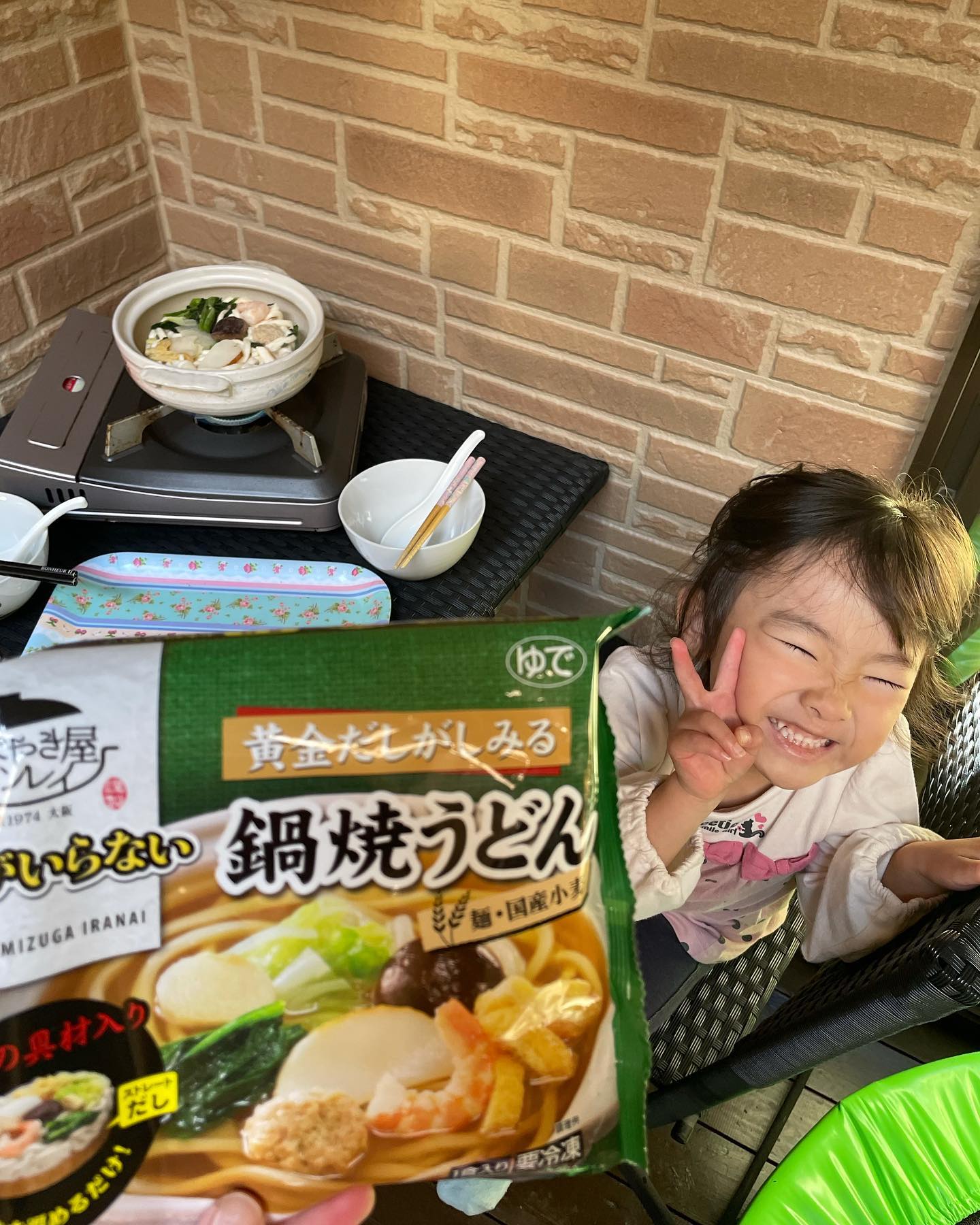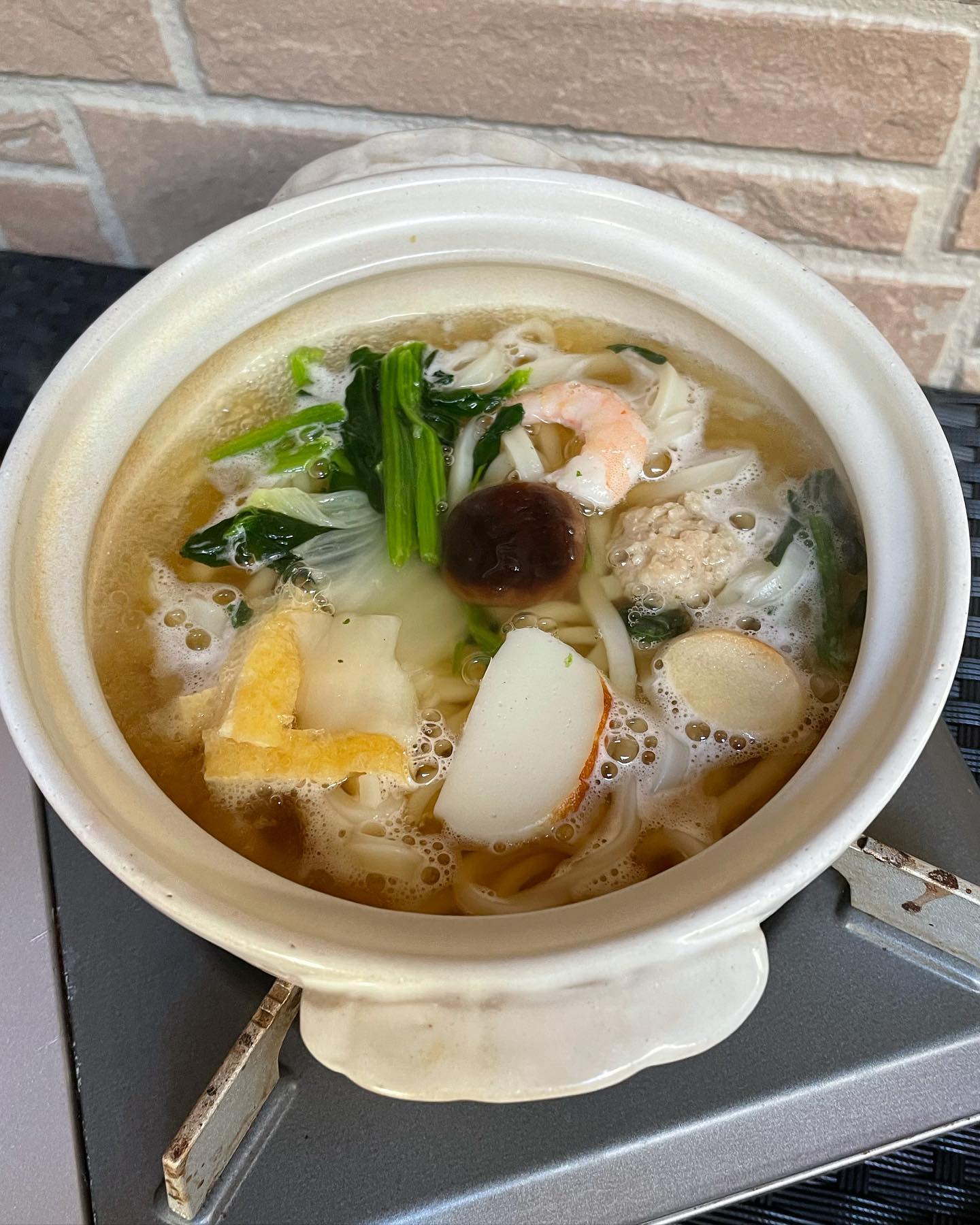 お水がいらない 鍋焼うどん❤️ だし、麺、具が一つになった鍋焼うどん✨ お鍋に入れて温めるだけでお召し上がりいただけます✨ <だし>そうだかつお節、さば節、いわし節、真昆布、椎茸から丁寧にとった関西の黄金だし。追い鰹で風味豊かに仕上げました✨ <具材>8種の具材入り/えび、つくね、椎茸、ほうれん草、白菜、きざみ揚げ、焼かまぼこ、麩 <麺>国産小麦を使用 具沢山のうどんが手軽に食べれる💖 中庭でご飯✨ お外でご飯は新鮮で娘がすごく喜んでた☺️ 雰囲気違うともりもり食べるね(笑) キンレイさんのは簡単だから外で食べるのも楽です✨ 肌寒くなった日に温かいうどんが美味しい💖 余ったつゆで雑炊作っちゃった😆✨ #PR #株式会社キンレイ #キンレイのある食卓 #火にかけたら料理でしょ #キンレイ #なべやき屋キンレイ #笑顔の食卓を #鍋焼うどん #キャンプ飯 #monipla #kinrei_fan