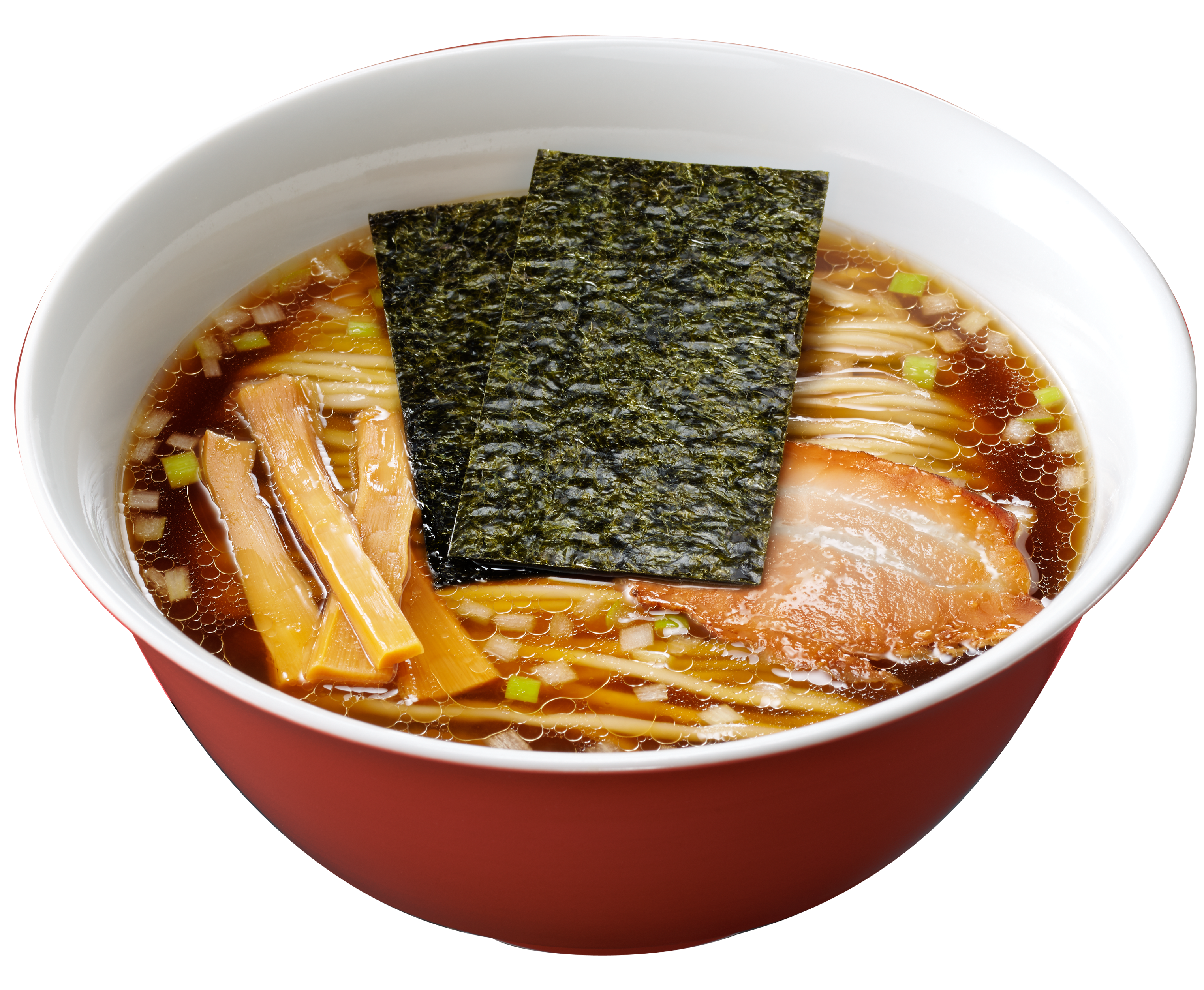 <具材>スープの味わいを引き立てるシンプルな具材を盛り付けました。 / 直火焼きチャーシュー、メンマ、白ねぎ、別添焼きのり入り