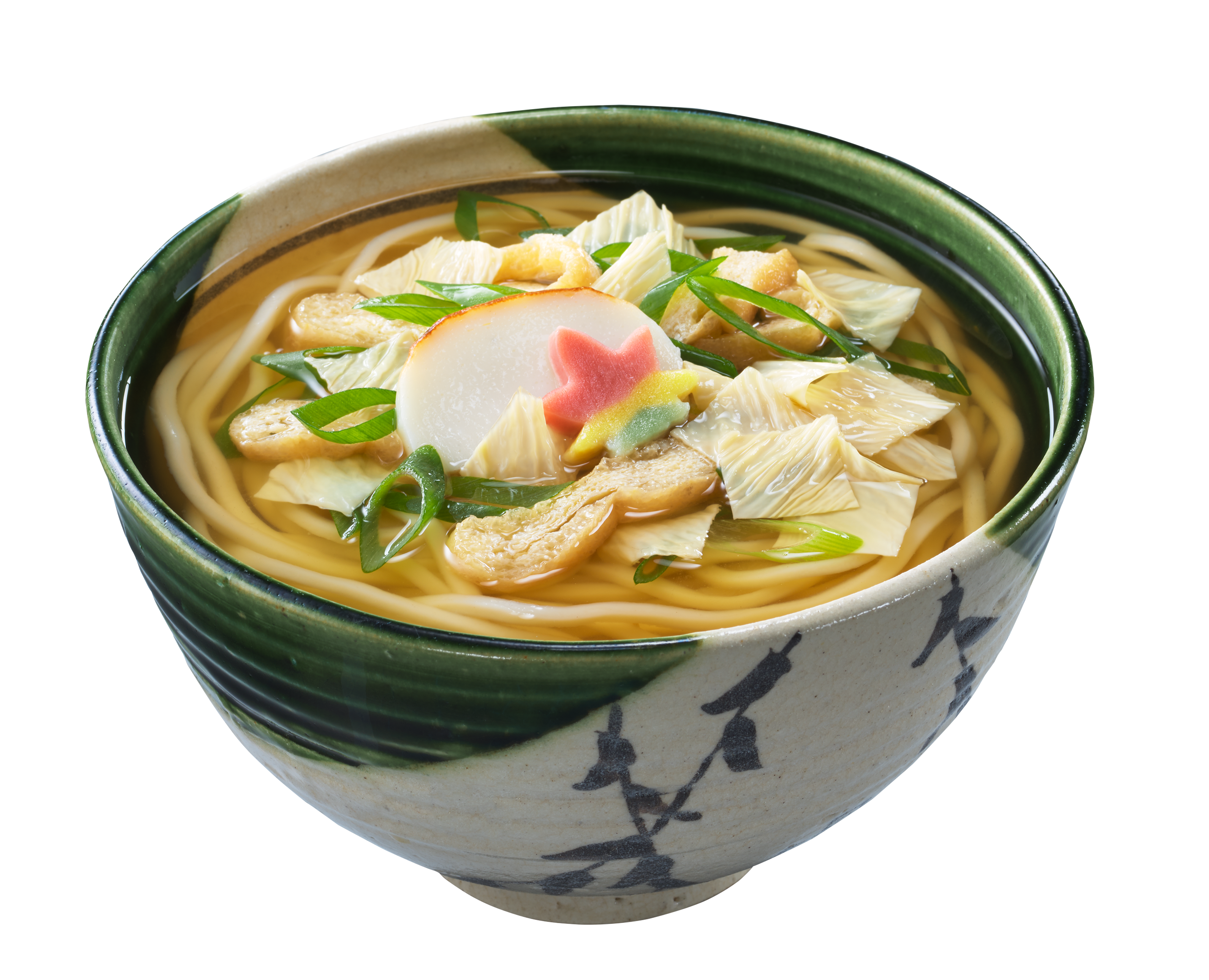 <具材>白ねぎ、鶏肉、椎茸、きざみ揚げ、麩
