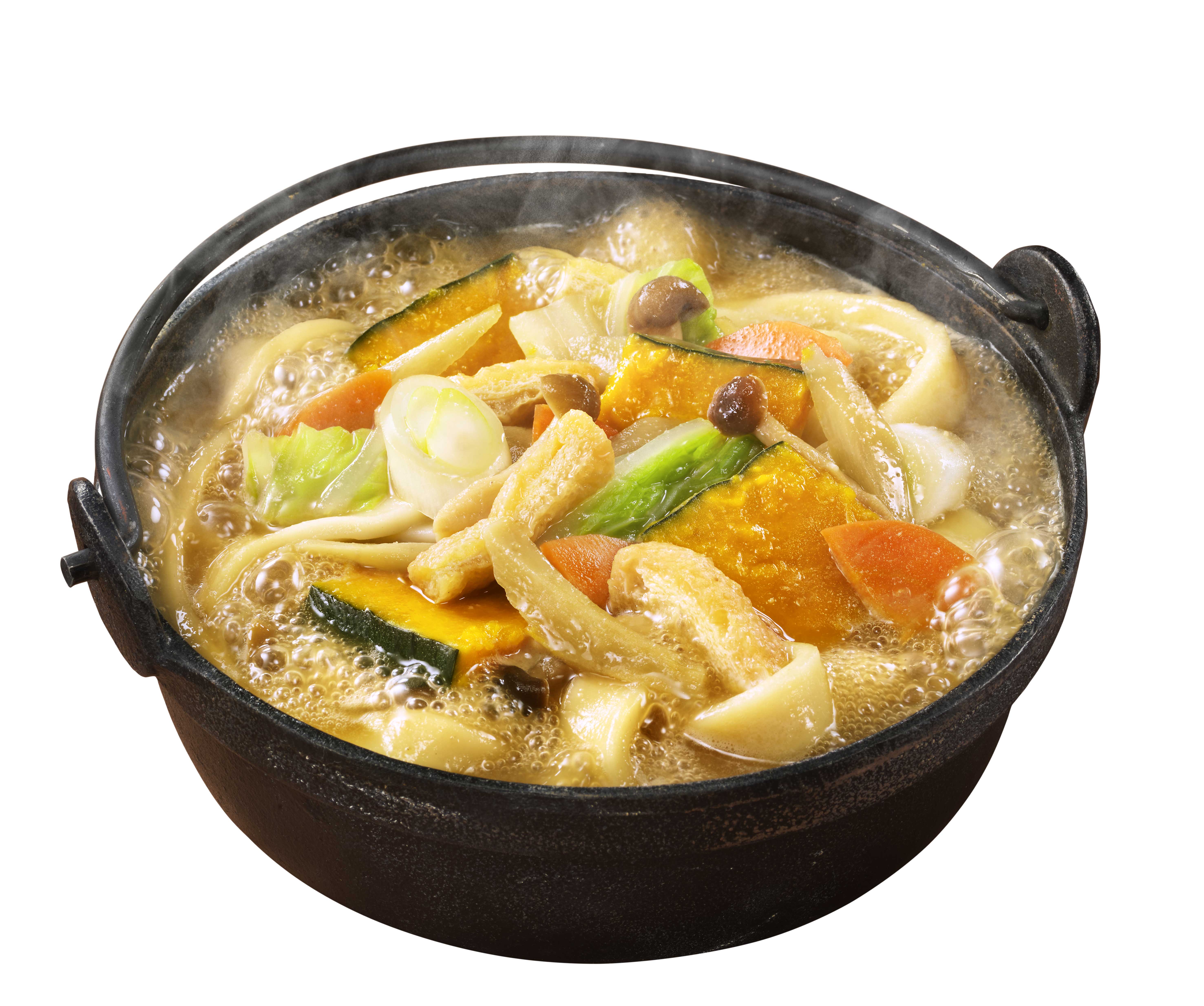 <つゆ>かぼちゃの甘み、野菜の旨味がとけ込んだコクと深みのある味噌仕立てのつゆです。