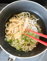 ③うどんに、九条ねぎ、きざみ揚げを絡めながら持ち上げ、そして啜る