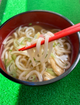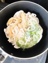 九条ねぎは斜め切り、油揚げも細長く刻み、うどんと一体になって味わうことができるようにしております。