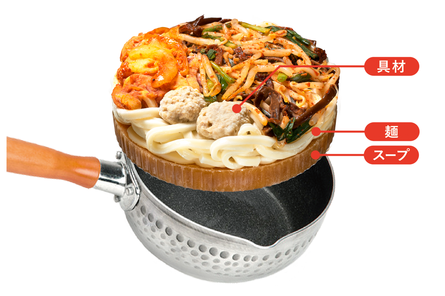 ストレートスープ、麺、具材が3層構造になって凍っているので、そのまま温めるだけ!