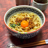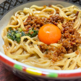 台湾ミンチ(唐辛子とニンニクを効かせた醤油味のピリ辛ミンチ)を極太麺に乗せた汁なし麺の一種。