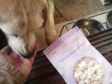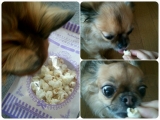 【愛犬用おやつ】バター食塩不使用! とうもろこしの味と香りが美味しいポップコーン 【モニター犬のベリーさん】 【ボンボンママの無添加キッチン ポップコーン】 初めは何をくれるかなという感じでお座りするベリーさんです 手からくわえて、一度地面に落として匂いを… 2014/11/21