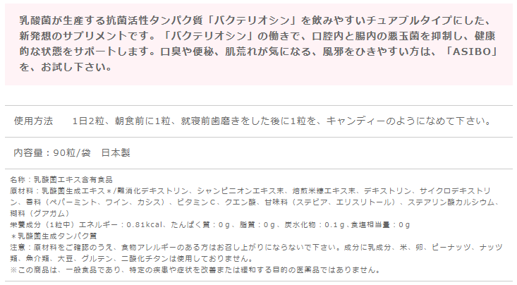 「Copy Nature ASIBO(アシボ)」は、善玉菌のエサとなる「バクテリオシン(タンパク質)」や「難消化性デキストリン(食物繊維)」を含んだサプリメント。乳酸菌やビフィズス菌を外から摂取するのではなく、もともと私たちの腸内や口内に存在する善玉菌を育てるとのこと。