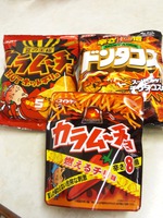 コイケヤさんの辛いおやつをお試しさせていただきました 左から カラムーチョHOTホットチリタコス味辛さ5倍 カラムーチョ燃えるチリ味辛さ8倍 ドンタコススーパーホットチリタコス味辛さ10倍 赤い大丈夫か、アタシ では、いただきまーーーす まず、… 2013/08/02