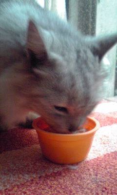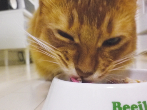 我が家の王子が必死で食べている表情を載せます^^; こちらのフードはお皿に入れた時点でよほどいい香りがするのか、ぐるぐる言いながらずっとつきまとってきました! 普段はドライフードをあげていて、夏場は食欲が落ちるのですが、こちらのご飯はあっという間に完食ですやっぱりおいしいものだと食べるのです… 2012/08/04