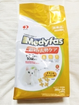 穀類(とうもろこし、コーングルテンミール)、肉類(ミートミール、チキンミール、チキンレバーパウダー)、豆類(おから)、油脂類(動物性油脂、共役リノール酸、ガンマ-リノレン酸)、魚介類(フィッシュミール:DHA・EPA源、フィッシュエキス)、セルロース、糖類(フラクトオリゴ糖)、卵類(ヨード卵粉末)、シャンピニオン、L-カルニチン、ビール酵母、ビタミン類(A、D3、E、K3、B1、B2、パントテン酸、ナイアシン、B6、葉酸、ビオチン、B12、コリン、イノシトール)、ミネラル類(カルシウム、リン、ナトリウム、カリウム、塩素、鉄、コバルト、銅、マンガン、亜鉛、ヨウ素)、アミノ酸類(メチオニン、タウリン)、酸化防止剤(ローズマリー抽出物、ミックストコフェロール)