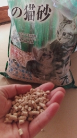 ひのきの香りが付いたとっても軽い猫砂です。おしっこがかかった所はピンク色に変わります。