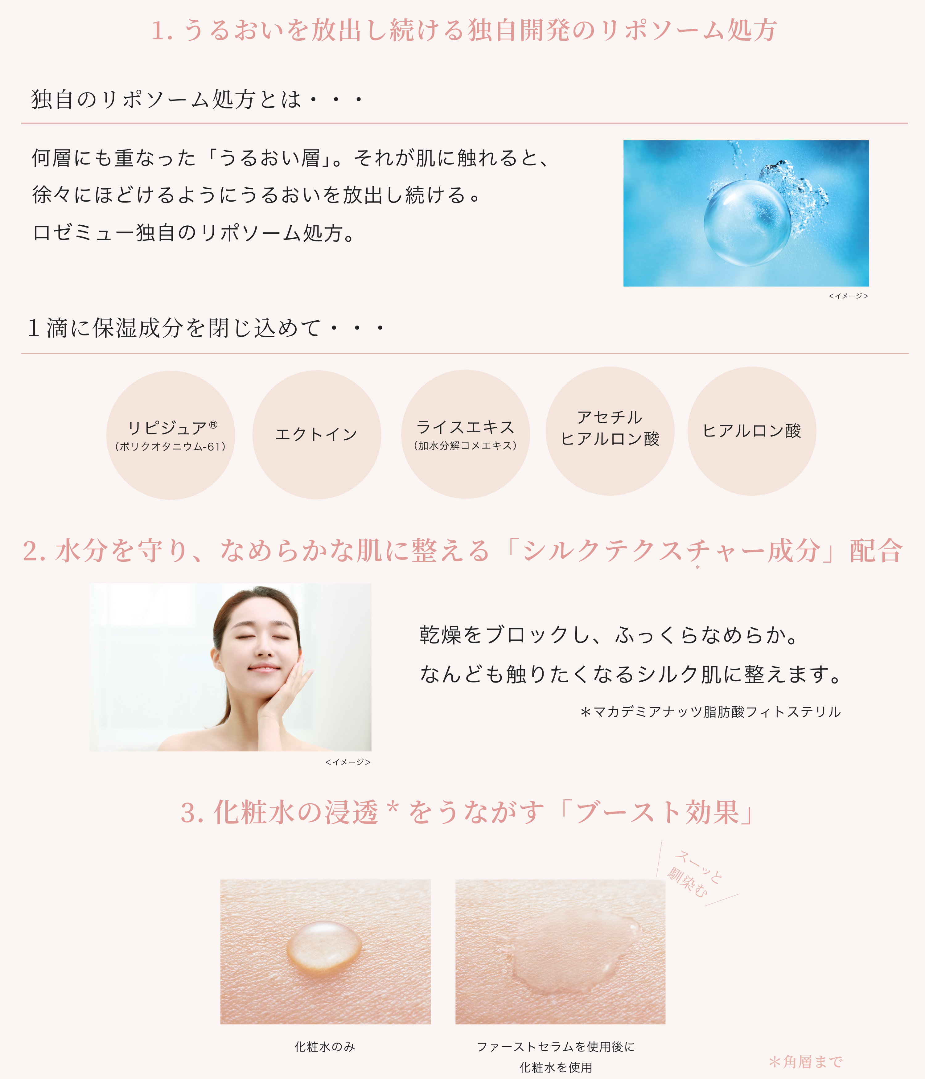 ロゼミュー ファーストセラム 4日分 を使ってみました 乾燥肌をリセット、瞬間シルク肌美容液 うるおいを放出し続けるリポソーム処方 洗顔後に使用です 少しとろみのあるテクスチャー のびがよく、肌なじみが良いです しっとりとした使い心地 べたつかずに、つるんとしたふっく… 2023/09/28
